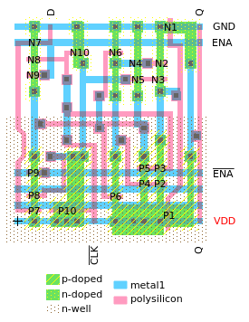 ENA are both high. However, the new data is only visible at the output Q after a negative edge on